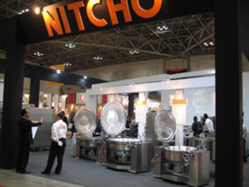 日本調理機の展示ブースでは、東京ガスブースにも展示している低輻射熱式のガス回転釜と少しスペックを変えた製品が並ぶ。業務用調理鍋で天ぷら油を使う時は過昇温度防止装置付きでないと認可されない。