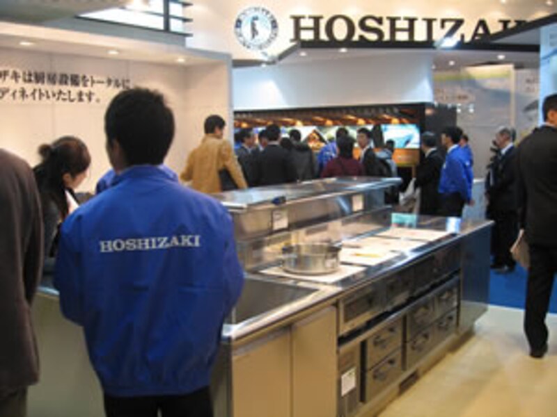 業務用アイスメーカーや冷凍冷蔵庫、食器洗い機などで実績の高いホシザキの展示ブース。IHクッカーを組込んだアイランドキッチンが目を引く。