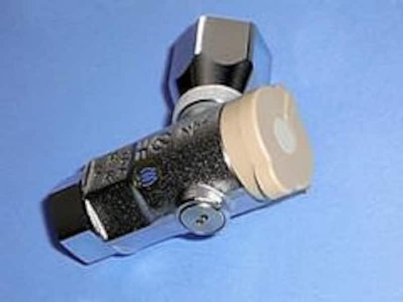 使われている「空気抜き孔付き機器接続ガス栓」はこんな形をしています。右にあるベージュ色の部分が開閉ツマミです。上の六角袋ナットはガスコンロとの接続に、後ろの袋ナットは給ガス管に接続します。