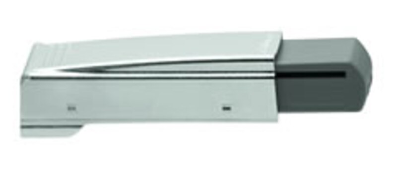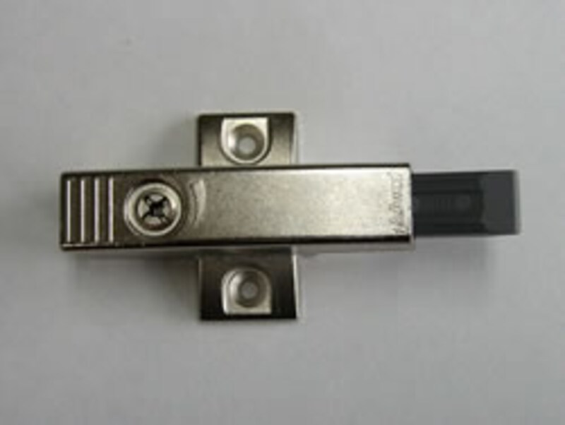 他にも扉用ブルモーションとしてこのような部品もあります。写真のようなキャビネットの木口部分に穴開けして取り付ける方式と、アダプタープレートを使って取り付ける方式があります。