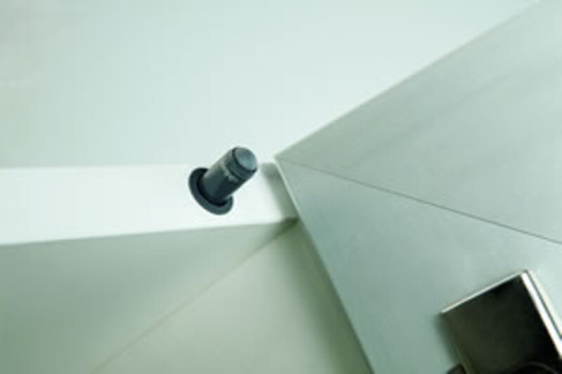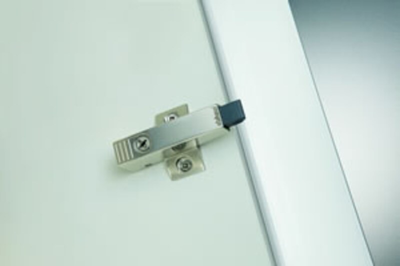 これが新しく開発されたブルモーション機構付きのスライド蝶番です。従来の蝶番の座の部分にこのブルモーション機構を取り付けることによって、扉がバタンと閉まるのを防ぎ、引出し同様柔らかく音もなく確実に閉まってくれるのです。