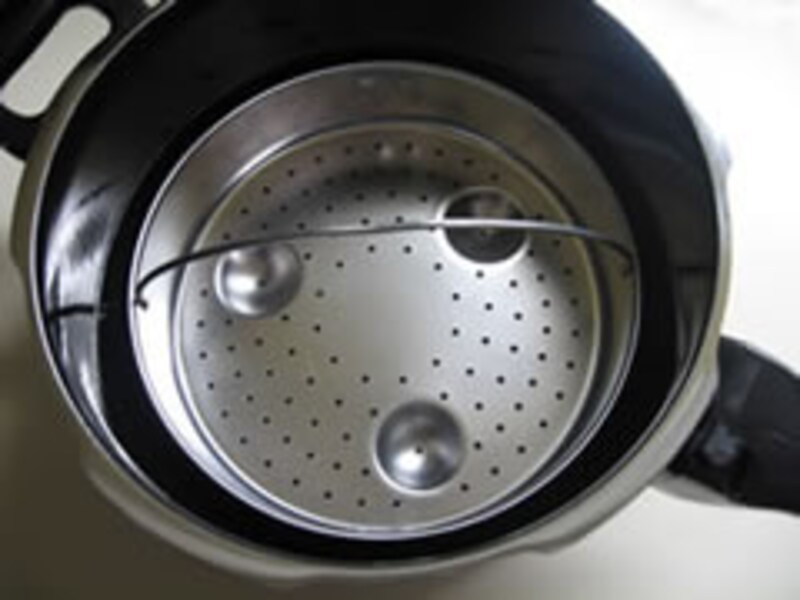 圧力鍋の標準部品として同梱されている蒸し器として利用できるバスケットは、スタンドを使ってこのようにセットして使います。