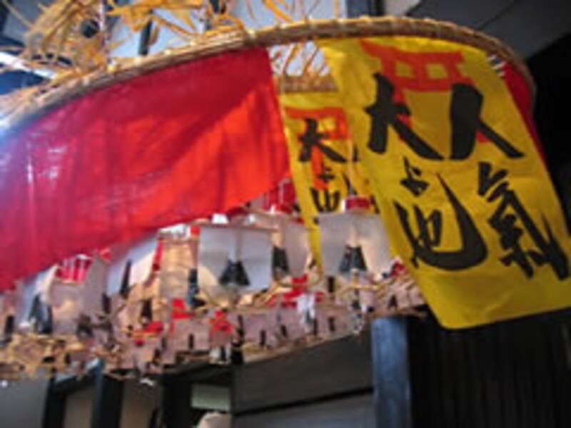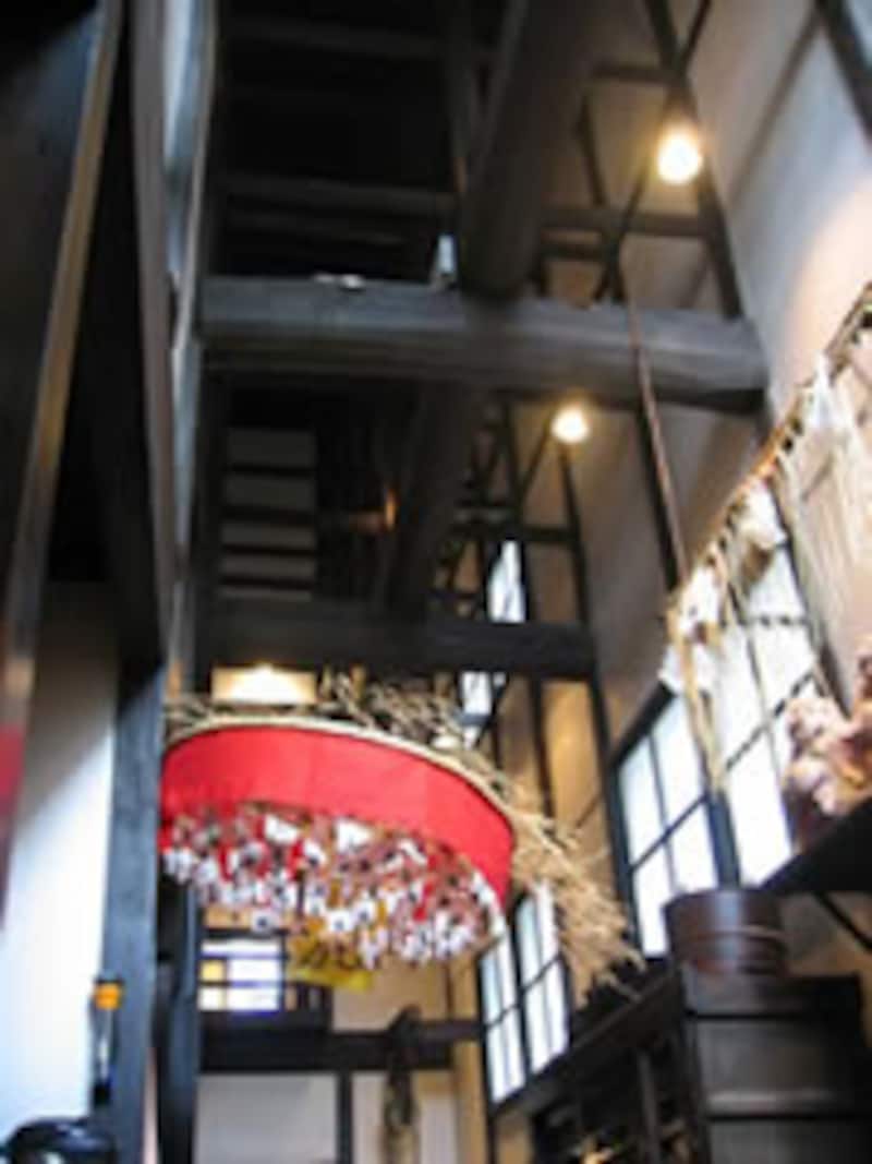 現在の百足屋は客商売のためこんなお守りも吹き抜けに飾られている。紙細工の鈴なりの人が千客万来の意味をあらわしているそうだ。