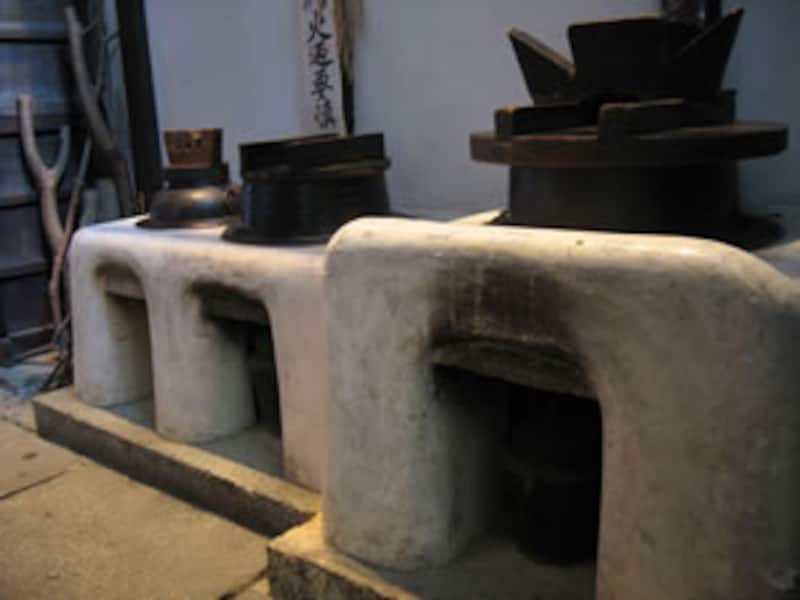 三連の竈。一番奥の大釜で湯を沸かし、次の羽釜で飯を炊く。一番手前の羽釜では煮物を作る。毎日変わらない食事を提供するのに最適な構成となっている。正月のお餅つきには一番奥の大釜にせいろをのせて蒸し上げ、少し奥まったところに餅つき臼を設置してつき上げる。