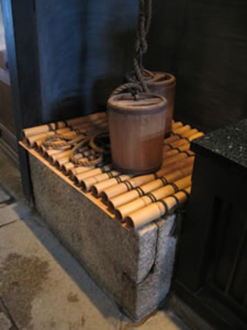 玄関側に一番近いところには今は使われていない井戸がある。深夜寝静まった頃、石に聞き耳を立てると水の流れる音が聞えてくるそうだ。