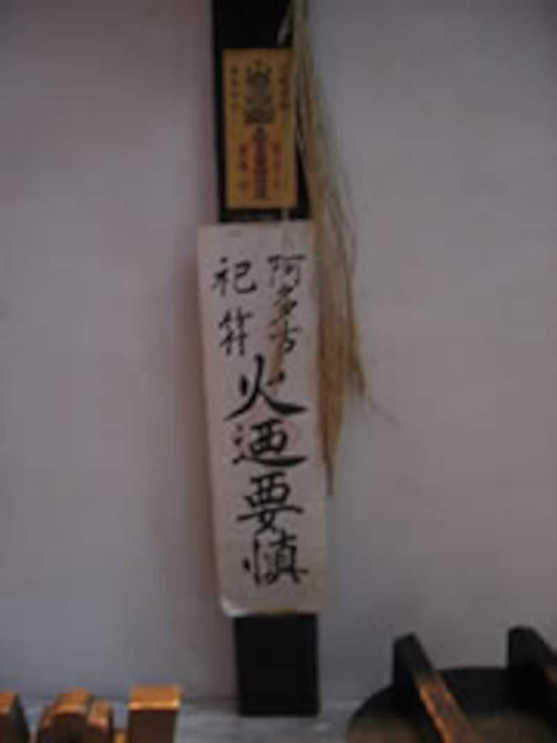 阿多古祀符(あたごきふ)火迺要慎(ひのようじん)と書かれたお札が「おくどさん」の柱に貼付けられている。京都の西北にある愛宕山山頂の愛宕神社は火の神様で昔の京都の人は年に一度は愛宕神社に詣でて火伏の護符である「阿多古祀符火迺要慎」を頂いてきて台所に貼るのが習わしであったという。