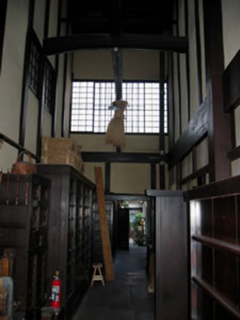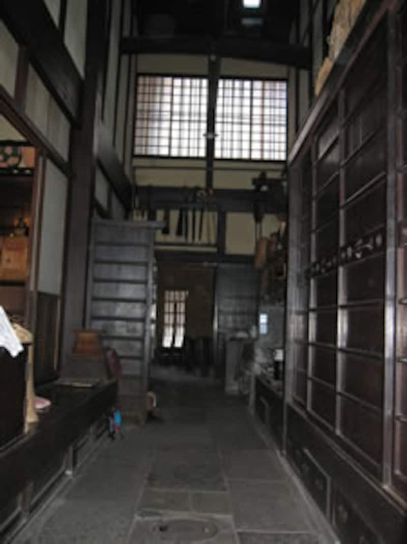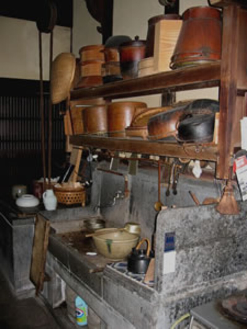 一昔前まで「白生地屋」を営んでいた商家は、通りに面した間口が約4間あり奥の蔵まで一直線に大八車が出入りできたそうで、約1メートル50センチの通路幅がある。ここに玄関から待ち合いをかねた「通り庭」があり、引き戸で区切られた台所がある。玄関手前から井戸と炊事場の研出し流し台、ガス置き台、水屋の食器棚が続く。