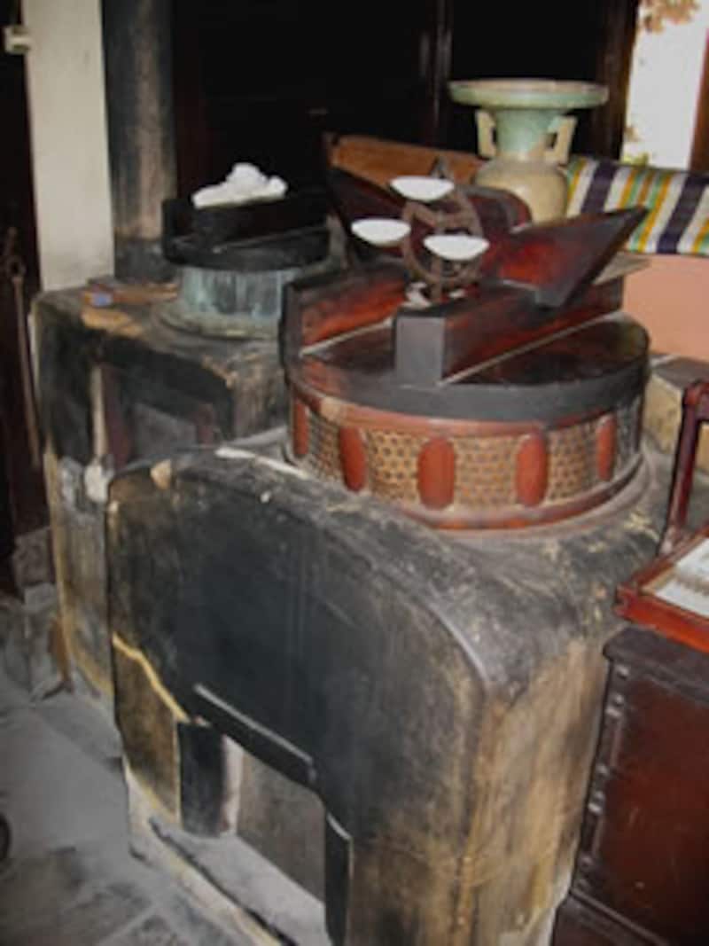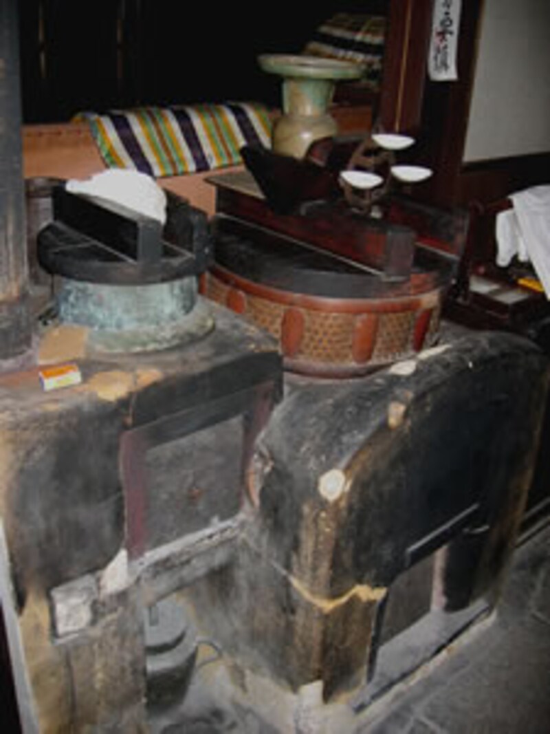 その昔は、この大竃の右手に連続して日常使われる三連の竃があったそうだ。大竃は主にお祝い事に使われることが多く、年末の餅つきの蒸籠に使った後、正月には五葉松を飾ってお祀りしたそうだ。お祝い事のひとつである産湯を沸かすためにもこの大竃が使われた。大竃の平面は奥行き880mm×幅750mmで高さは800mm。この竃も手前が一段盛り上がっており高さは920mmある。ここには釜径550φの大釜が乗せられている。左の小竈の巾寸法は600mm、奥行きが600mm、高さは980mm。