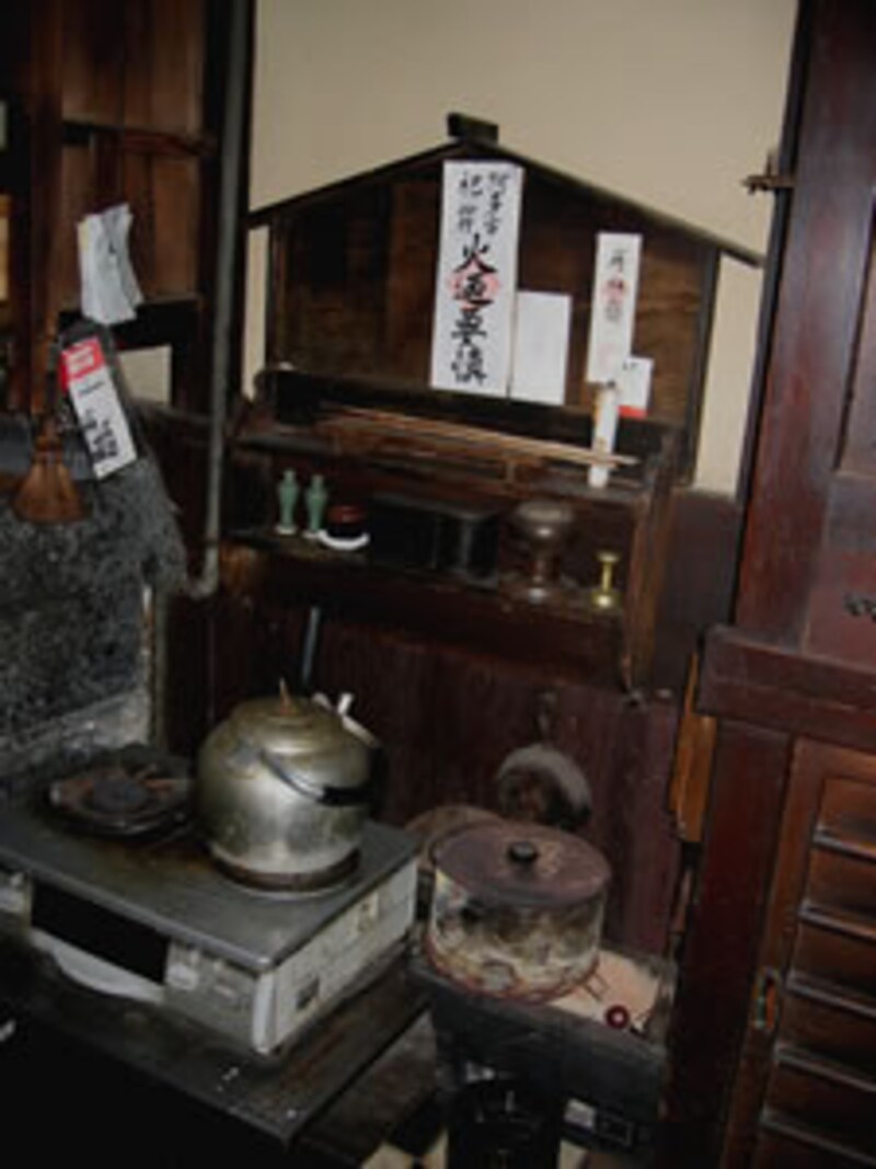 流し横にあるガステーブルと七輪。壁には祭壇が祀られ、「阿多古祀符 火迺要慎」のお札がここでも見られる。