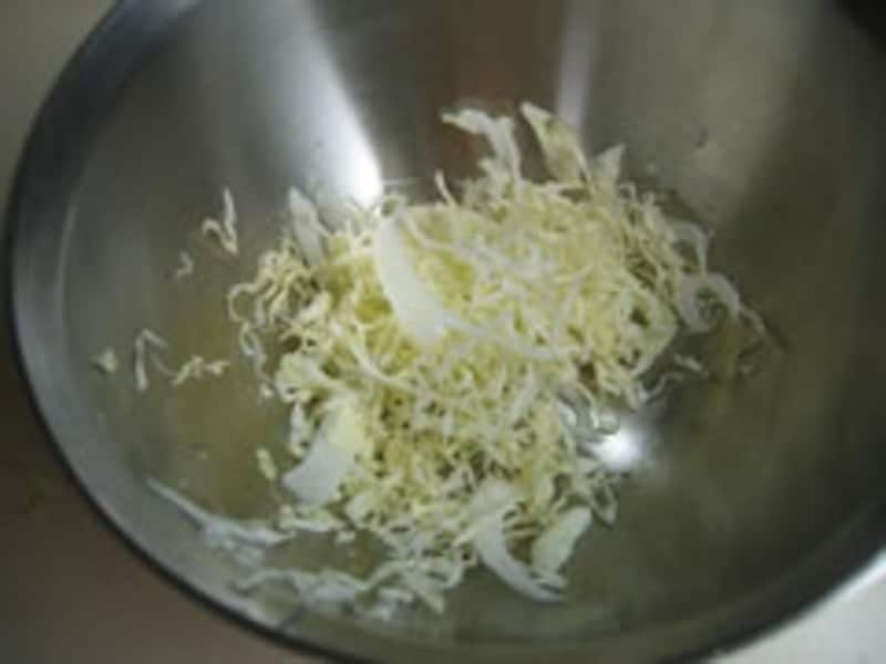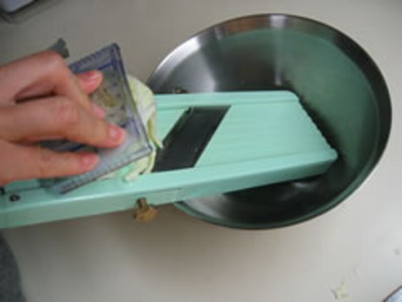 手をけがしないように押さえ部品を使って軽くスライスする。
