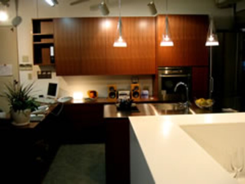 Type-02/2000×2100のL字型空間に納められた1200mm高さのアームレベル型キッチンは、キッチンの手元を見せないでオープン空間を作る手法として効果的なプランだ。リビングやダイニング側からも収納が確保されている。参考価格:1,940,000円(税込)