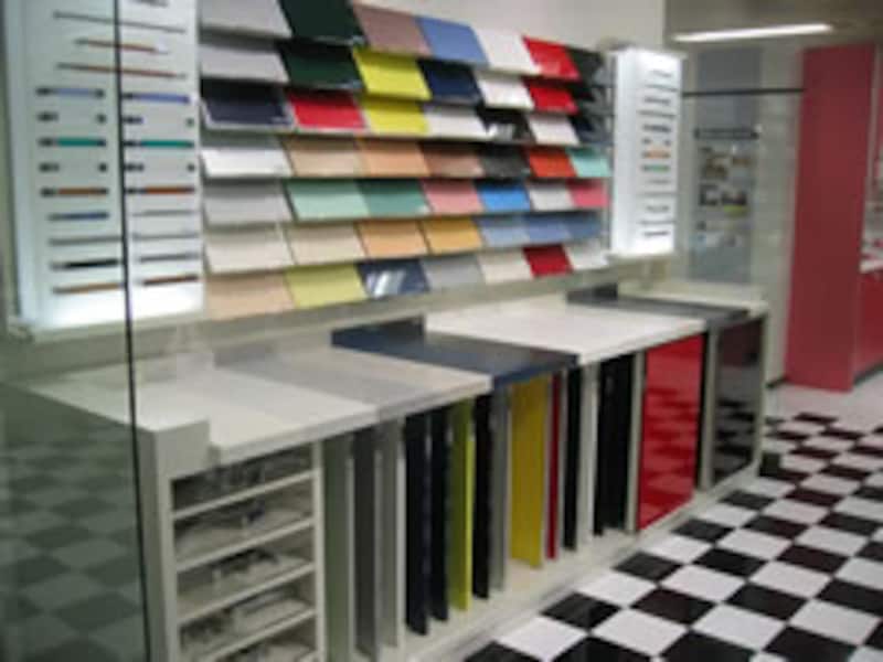 鏡面仕上げの扉が多く展示されているが、ライトウッドなど木目調の扉もバリエーションは充実している。