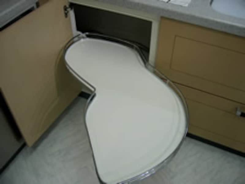 デッドスペースになりがちなコーナーユニットの回転棚はその形状もユニークだが非常に面白い回転方法で奥まで無駄なスペースを生じさせない優れもの。