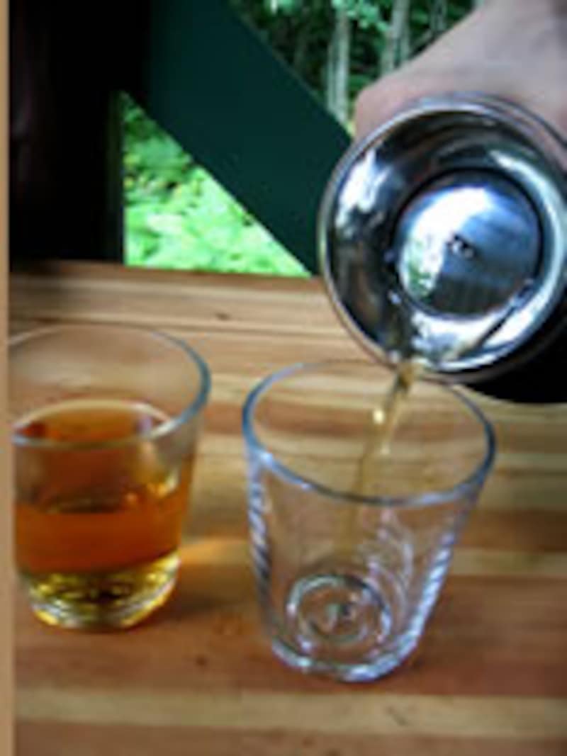 熱湯をゆっくり注いでから蓋をし軽くポンピングをします。2~3分程度静かに置いておいて湯のみやグラスに注ぎます。ティーメーカーは注ぎ口とポンピングユニットの隙間からお茶が出てきます。同じように液は伝いません。 写真のグラス2個がセットになっています。 |