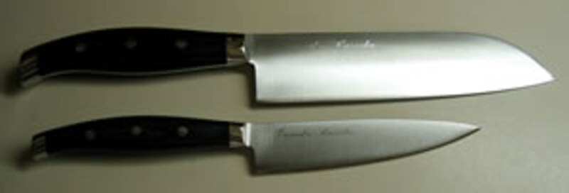 | ◇三徳包丁外形寸法 21mmd×48mmh×310mml(刃渡り180mm)◇本体重量 212g ◇ペティナイフ外形寸法 19mmd×35mmh×245mml(刃渡り130mm)◇本体重量 102g | ||