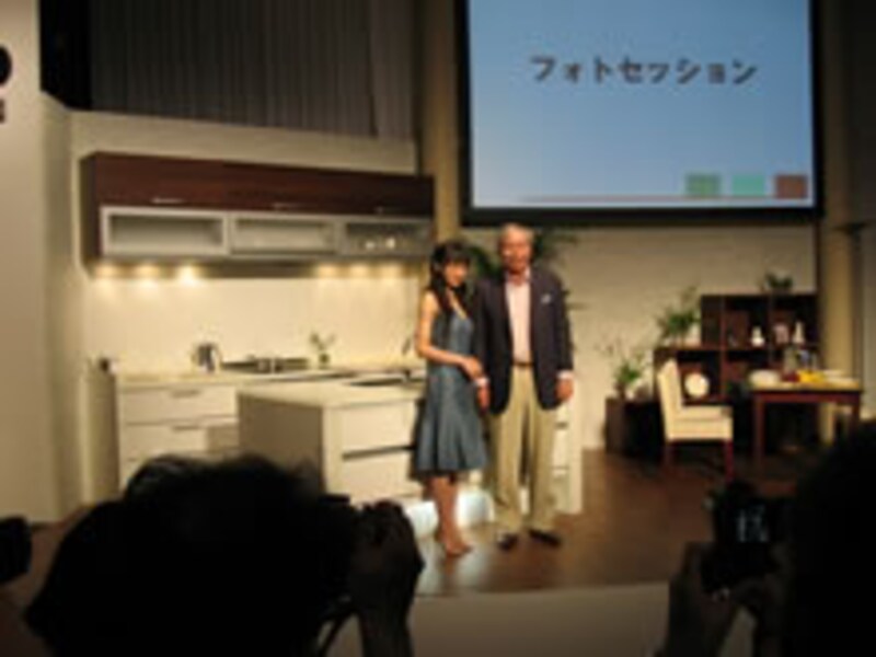 真っ白なベールに隠されていた新キッチンCUISIAシリーズとLEGACESSシリーズからオープニングの鐘の音に合わせてベールが拭い取られ、プレゼンテーションが始まった。 木瀬社長、山田キッチン洗面事業部長の挨拶に続いて、岡開発部長と森川企画部員による商品紹介、柏木ショールームアドバイザーによる新しい顧客対応システムの紹介、質疑応答等が分刻みのタイムテーブル通りに進行し、そのあと9日から放映開始となった新TVCMが公開され、ついでゲストの菅野美穂さんが登場すると、今まで静かだった最前列の取材カメラが一斉に立ち上がってストロボをたきシャッターを切る。最後は木瀬社長と菅野さんのツーショット撮影会でお開き。 気遅れてしまったような雑誌取材の記者連がようやく新商品を前にした個別の説明に聞き入っていたのがとても印象的な発表会だった。 |
