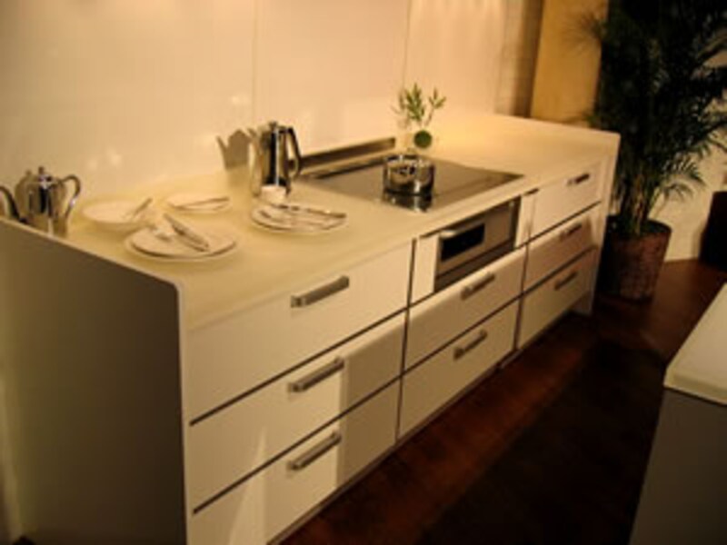 2700mm間口クックトップ側のデザイン。3mmの段差でフラットに納まるIHクッキングヒーターはキッチン空間をより清潔に維持できる。 |