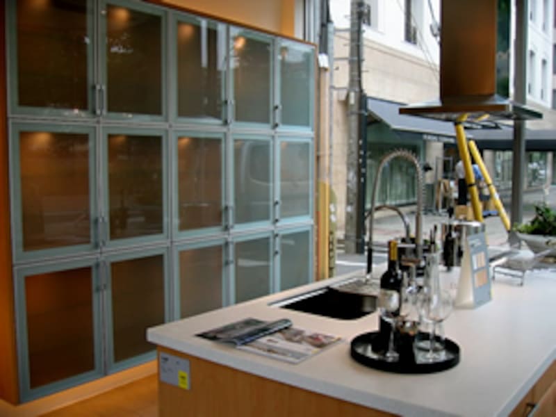 入り口近くのこのセットはLAGOシリーズ。3000mm×1200mmのアイランドキッチンとガラス扉のカップボードで構成されている。 アイランド部分が2,870,000円(記事中のnolteの価格表示はすべてビルトイン機器込み、税別です)、カップボード部分は1,820,000円。 |