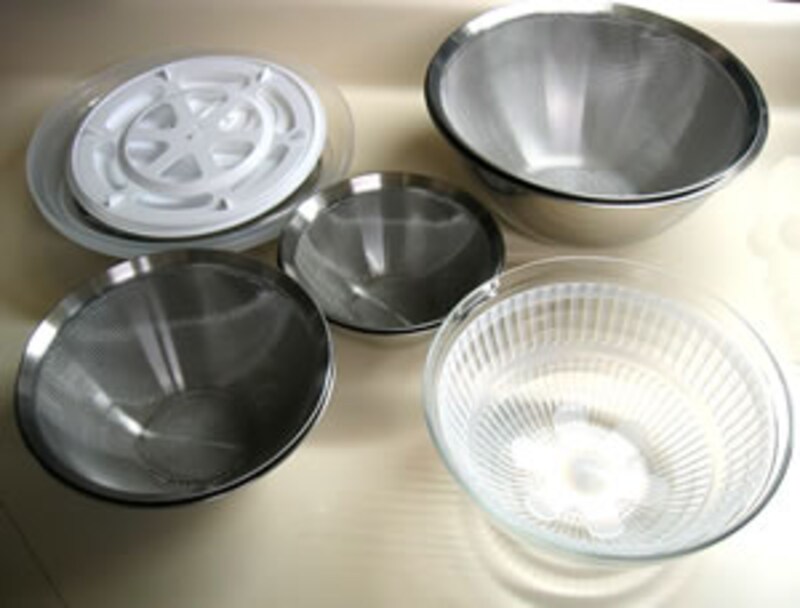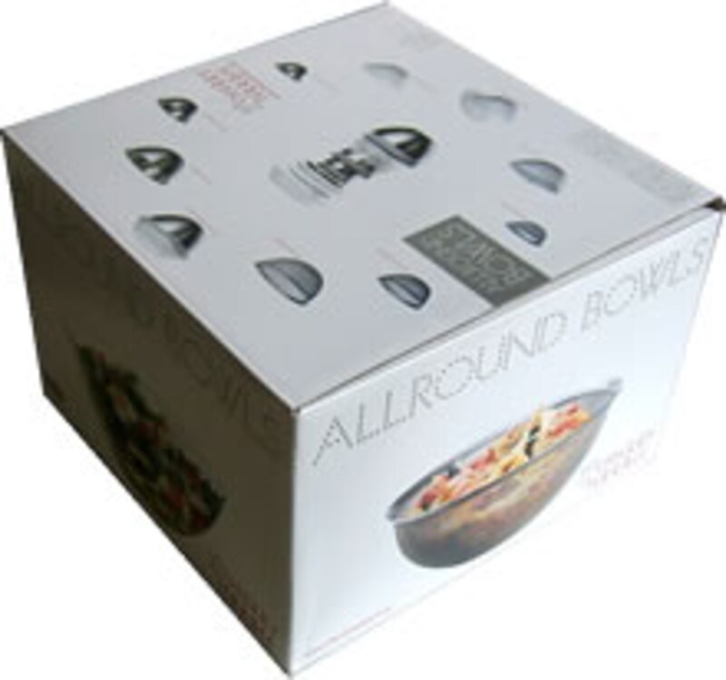 | オールラウンドボウルズフルセットは上の写真のように大中小三つのステンレスボウルと、同じく大中小のステンレスザル、ガラスボウルとサラダスピナー用ザルとスピナー、そして大中サイズのポリプロピレン製の蓋とステンレス製の蓋の合計12点から構成されています。 | ||