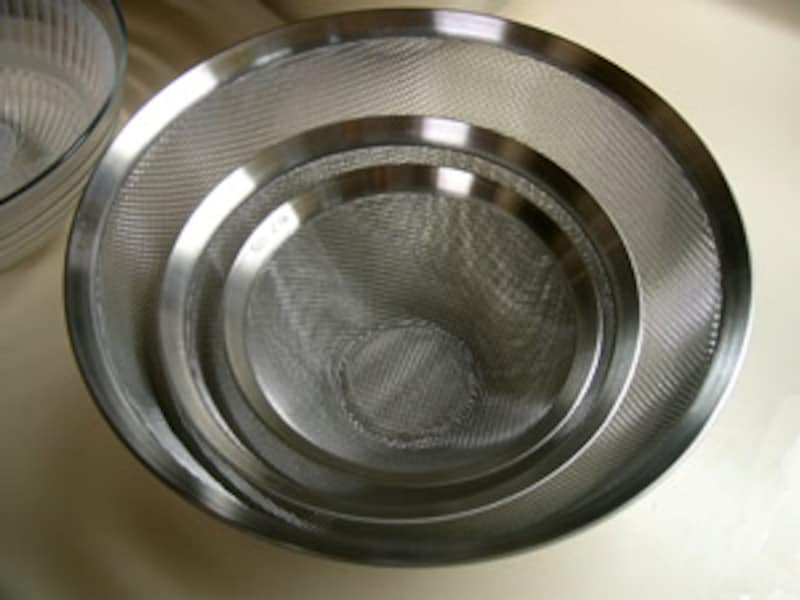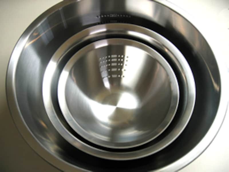 | ステンレスザルのサイズは大268mmφ×h/121mm、中203mmφ×h/88mm、小165mmφ×h/71mmの三種類で、ボウルのサイズよりほんの少し小さいためにボウルとザルを重ねて使うことができます。 | ||
