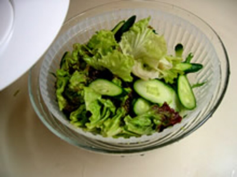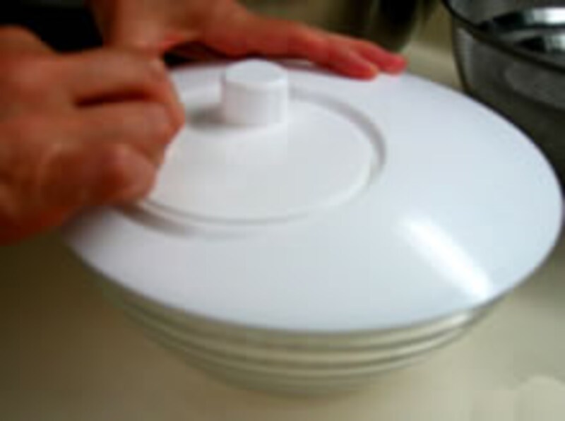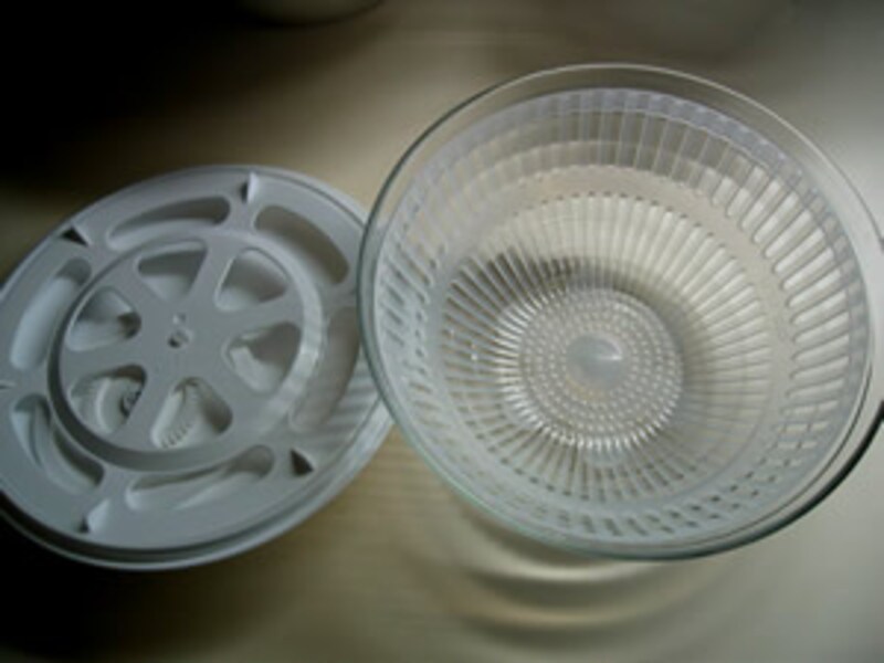 | これがサラダスピナーです。ガラスのボウルにスピナーベースを置き、スピナーザルをセットして蓋をすればすぐに使えます。 脱水する水切り野菜を中にいれ、蓋のつまみをゆっくり回し始めると加速されて野菜の表面の水気をきれいに取り去ることができます。 | ||