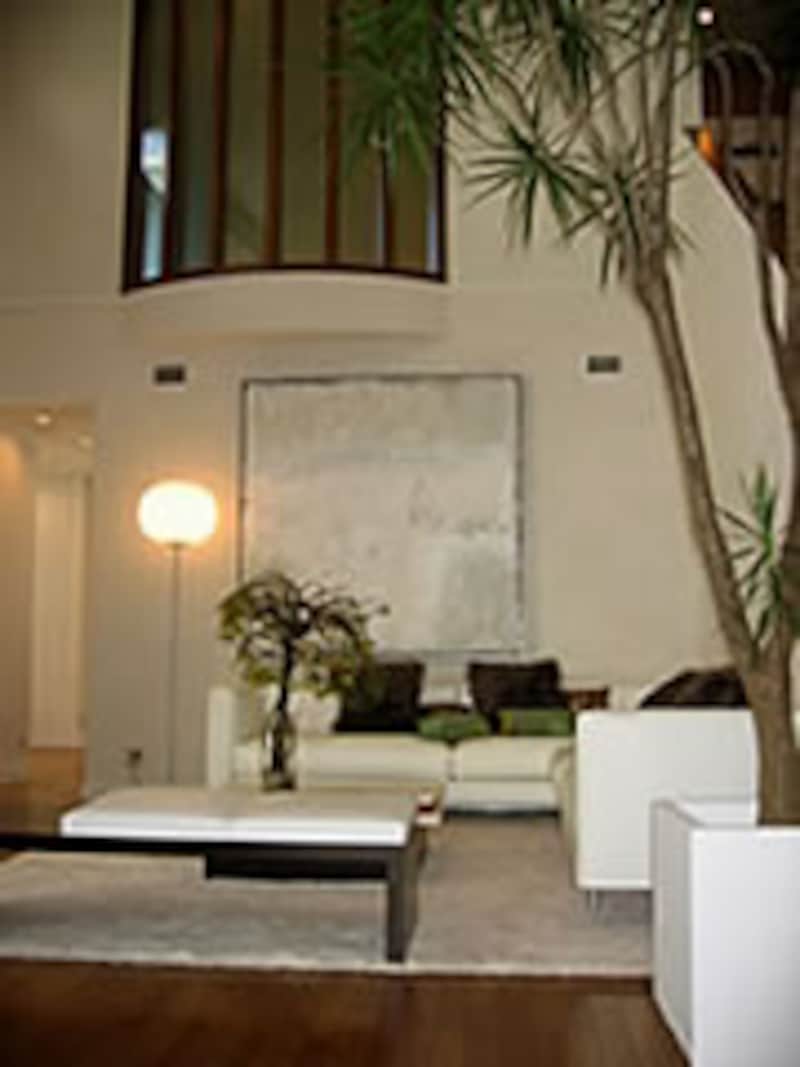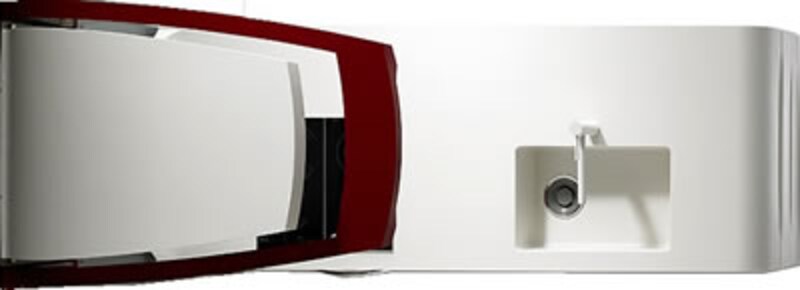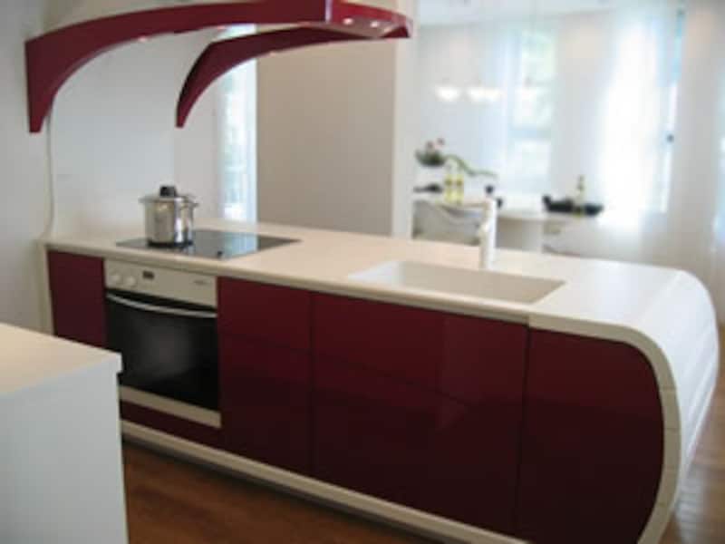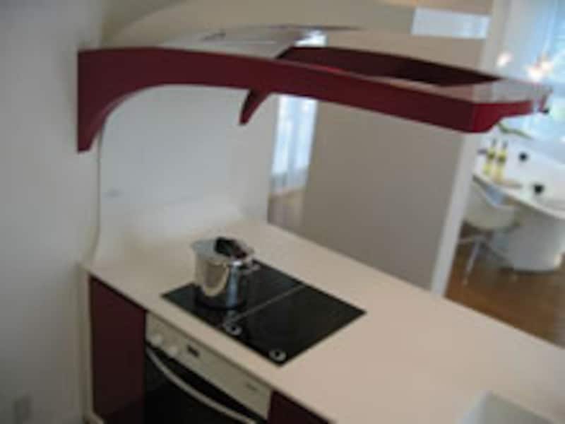 | これが、そのキッチンを上から見た写真です。ワークトップとベースユニット全体を囲った白い部分は人造大理石で一体加工されています。スチール鋼板で作られた白いレンジフードとダウンライトやスイッチの組み込まれたカンチレバーのウィングが軽快なイメージを強調しています。カーデザイナーとして知られるジウジアローの個性がそのままキッチンに生かされています。(この写真のみ三菱地所ホーム提供。他の写真はすべて黒田が撮影したものです。) | ||