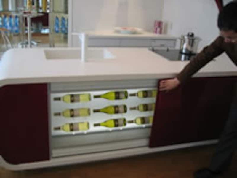| ダイニング側のベースキャビネットは引き戸になっていて、バックライトを仕込んだ飾り棚やワインラックが準備されている。 | ||