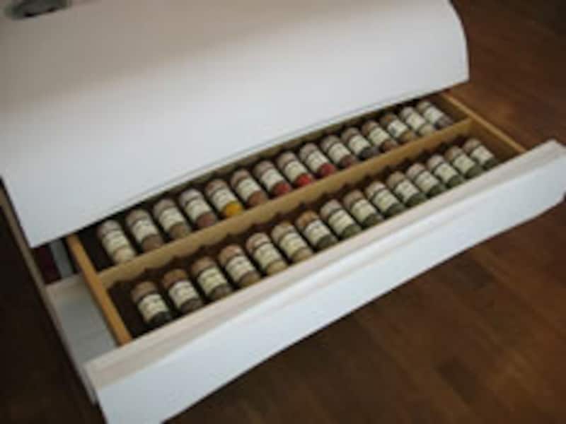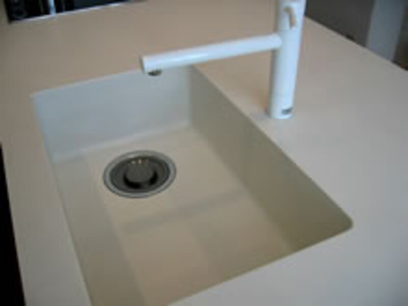 | 人造大理石一体型のシンクと、側面のアール部分に仕込まれた3段引き出し。 | ||