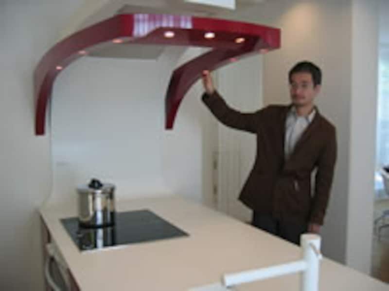 | ウィングに手をかける開発担当のT氏。ユニークなフォルムがこのキッチンをひときわ際立たせている。クックトップはラジエントとIHが2連づつ並ぶ。 | ||