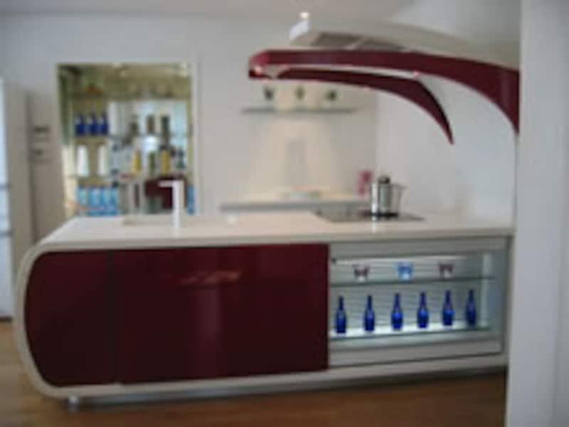 | これが、そのキッチンを上から見た写真です。ワークトップとベースユニット全体を囲った白い部分は人造大理石で一体加工されています。スチール鋼板で作られた白いレンジフードとダウンライトやスイッチの組み込まれたカンチレバーのウィングが軽快なイメージを強調しています。カーデザイナーとして知られるジウジアローの個性がそのままキッチンに生かされています。(この写真のみ三菱地所ホーム提供。他の写真はすべて黒田が撮影したものです。) | ||