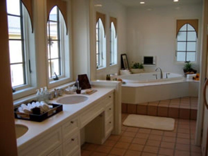 | 二階のバスルーム。手前にはダブルベイスンの洗面化粧台。右手にサウナ。バスルーム右手にはシャワーブースが続きます。 | ||