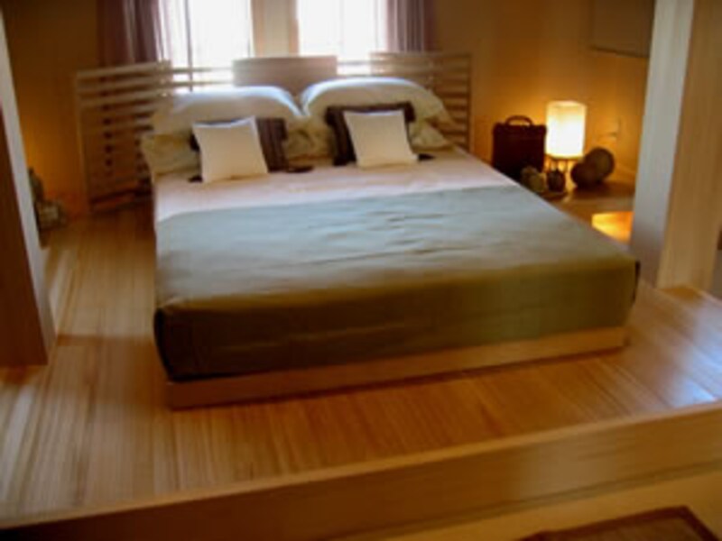 | マスターベッドルームは、町田ひろ子氏プロデュースの桐のベッドルーム。今年1月のケルン国際家具見本市に出展し、海外からも高い評価を得た健康・エコロジカル空間をモデルハウスで実現した。 | ||