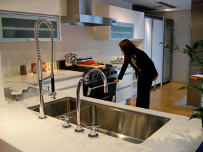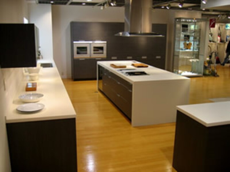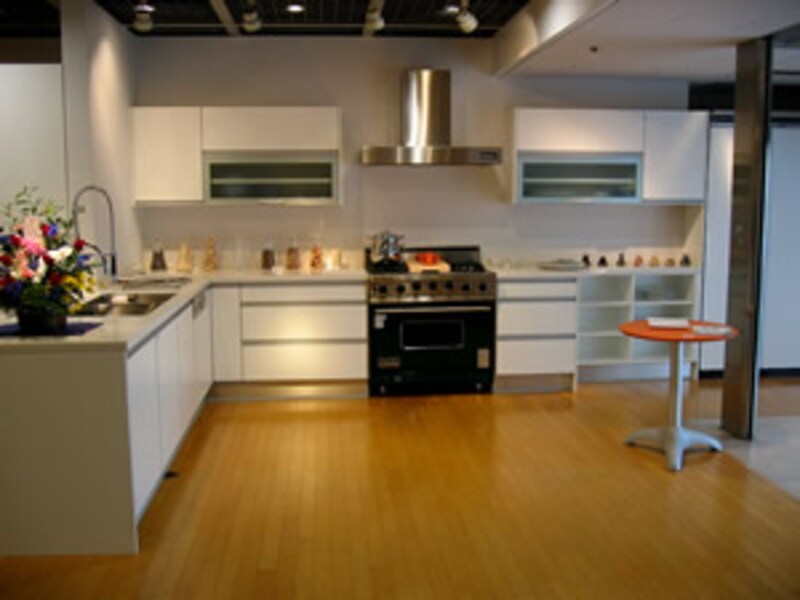 システムキッチンは「キッチンハウス」とのコラボレーションをもとに全面リニューアルし、上写真のアイランドキッチンと下写真のL型レイアウトの2セットが展示されています。 |