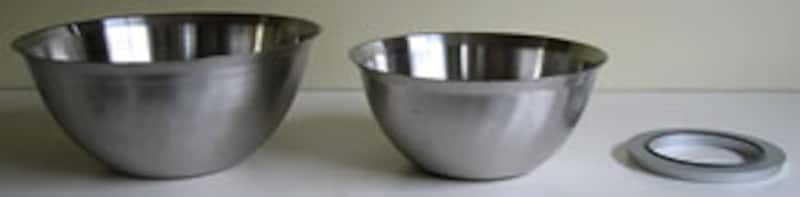 | 一番大きいステンレスボウルは内径270mm、深さ146mm、5.6Lit.、価格3,990円(税込み)。フランジのテーパーには水切りを良くする効果もあるようだ。 | ||