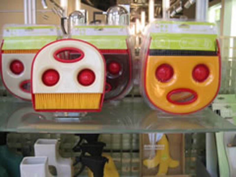 | 左は箸が貫通したユニークデザインのm2セラミックヌードル(¥1,260税込)。右はオトボケ顔のダストパンセット「TOKEY」(¥1,260税込)テーブル掃除ほうきとちり取りセット。 | ||