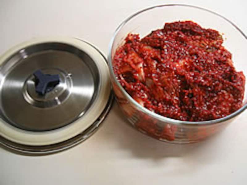 | 究極は「キムチ!」においは密閉できますが、蓋裏のシリコンパッキンにとうがらしの色が染まって左写真のように少し黄変するので「キムチ」の保存には専用容器として使うのがベターです。 | ||