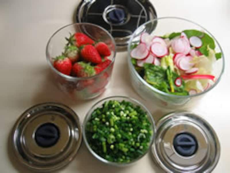 | サラダの材料、浅葱のみじん切り、煮豆などほとんどの食材が1週間程度は鮮度を保って保存できるので応用範囲が広がります。 | ||