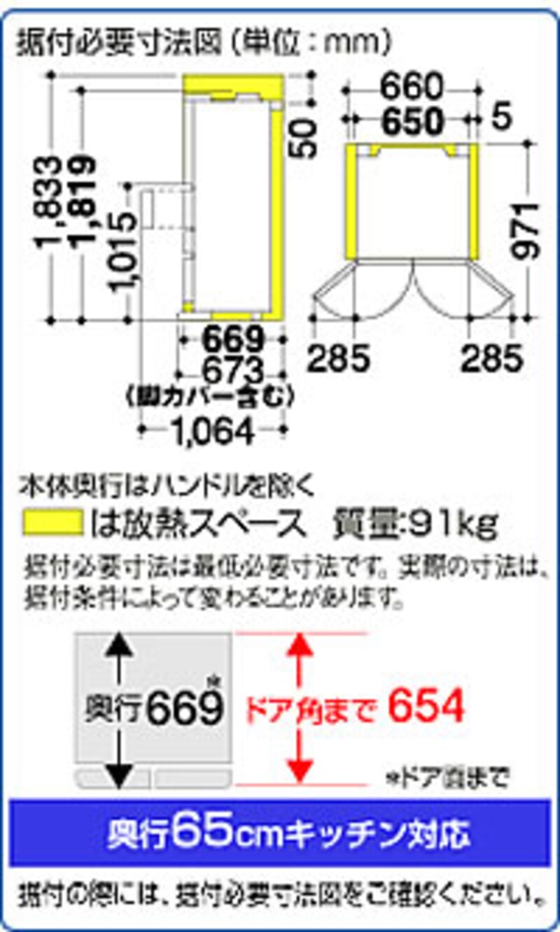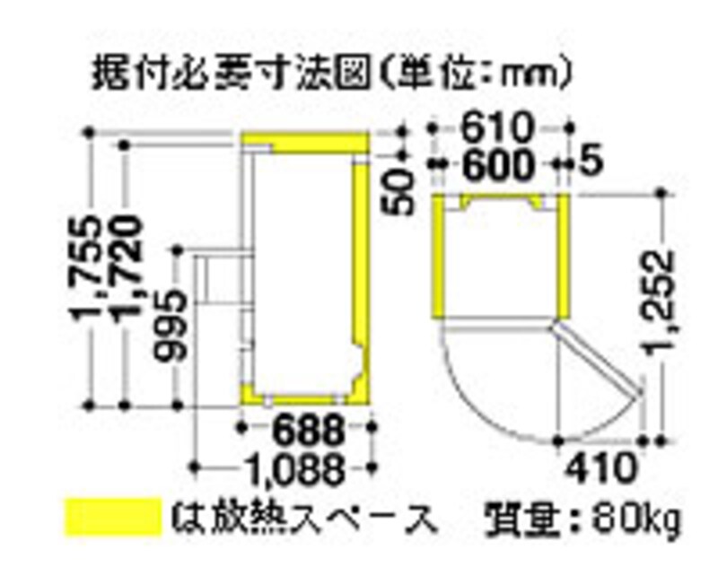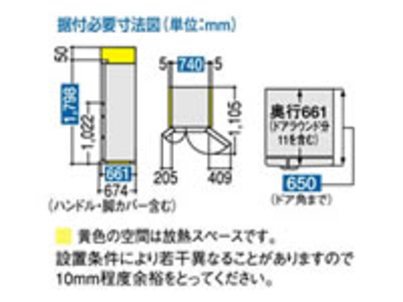 | ■日立冷凍冷蔵庫の2機種。左の片開きタイプは410mm。右の観音開きは左右両側ともに285mmが必要です。 | ||