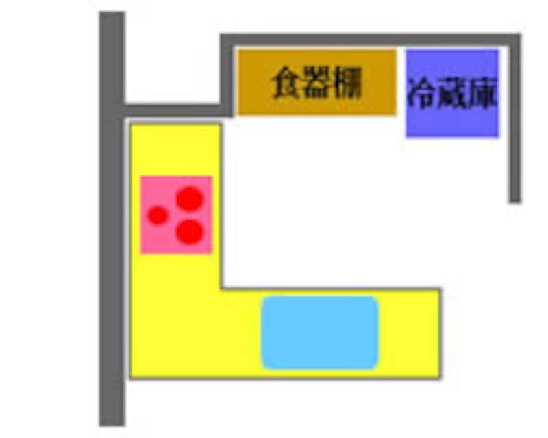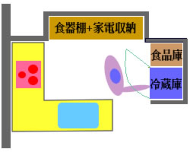 | ごく一般的なキッチンのレイアウトです。シンクの前をオープンにしたプランが人気で、最近のマンションのキッチンなどはほとんどがこのレイアウトを基本にしています。スペースは3帖~4帖程度で小家族用のキッチンとしてはマアマアの広さといえます。この場合上のくぼみの部分に冷蔵庫スペースや食器棚スペースとして注記が書かれていることが多いのです。 | 注記に従って実際に冷凍冷蔵庫や食器棚を配置すると上の図のようになります。 一見うまく入ったなと思われるかもしれませんが、よ~くご覧になってください。 そして、実際にここで調理作業を行うシミュレーションをやってみましょう。 |