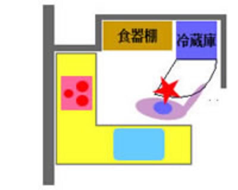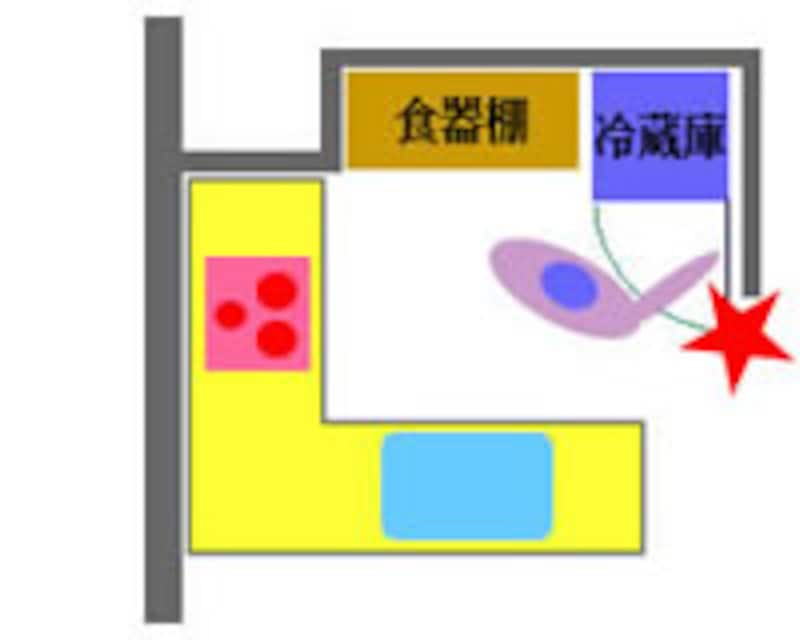 冷凍冷蔵庫の扉を全開できるようにするには、左開きタイプを採用することになりますが、今度は自分のからだと扉の位置関係が邪魔になり、回り込んで中身の出し入れをする非常に使い勝手の悪い配置となってしまいます。