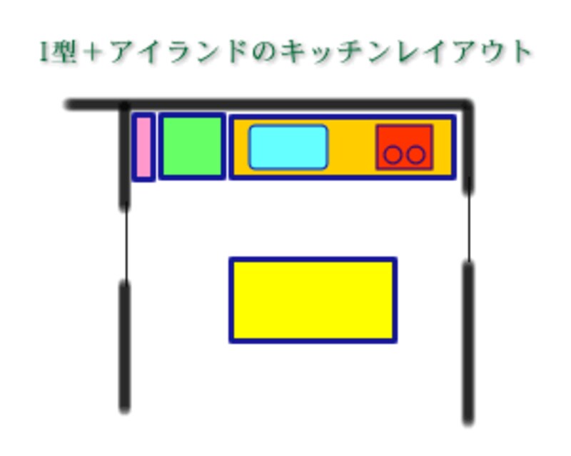 | I字型レイアウトをオープンに使う場合は、このようなアイランドカウンター(黄色)を用意することによって、キッチン作業面積の狭さをカバーすることが可能となります。 |