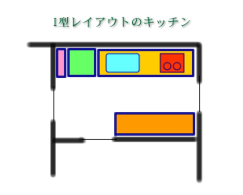 | このように、I字型はせいぜい2間間口(約3000mm~3600mm)までのキッチンに利用されるレイアウトであることがお分かりいただけるかと思います。並列設置のオレンジ色の部分は配膳台や家電品置場(炊飯器、ジャーポット、オーブントースター、電子レンジなど)として活用できるカップボードを表しています。 |