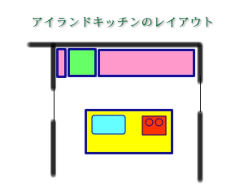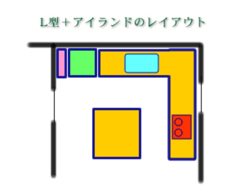 | L字型だけでは作業面積が足りない場合はこのようなアイランドカウンターを配置するのも良いでしょう。ただしシンクとコンロとは同一の作業面にレイアウトし連続作業ができるようにしたほうが使いやすいと思います。同じような意味合いからII字型とか廊下型と呼ぶシンクとコンロを別の作業面に配置するレイアウトもありますが、調理したものや鍋を振り返って使うというのはあまりお勧めできるレイアウトとはいえません。 |