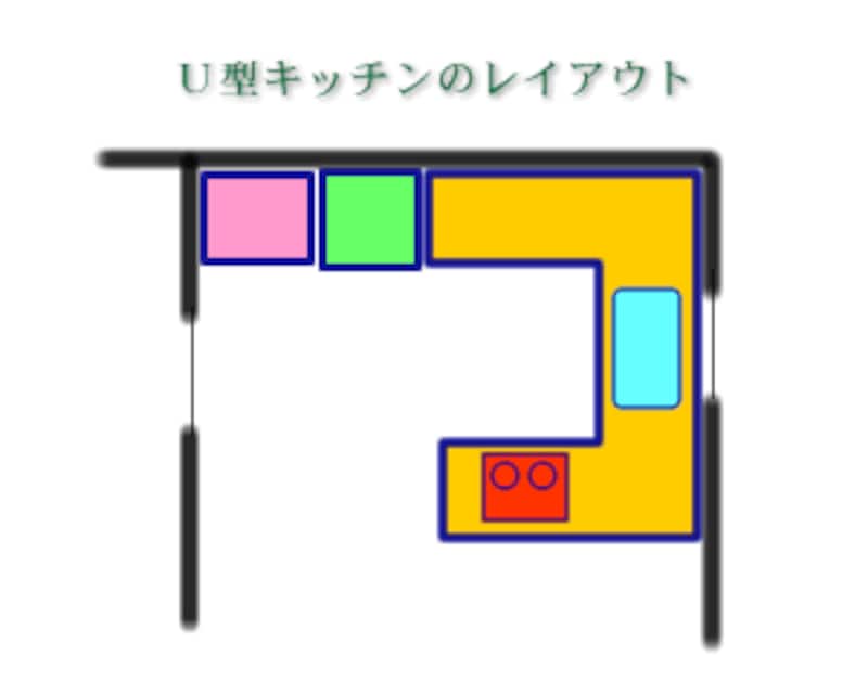 | オープンキッチンやセミオープンキッチンに使われたU字型レイアウトのキッチン。この図のようにコンロ側に壁がない時はペニンシュラータイプ(半島型)のレイアウトと呼びます。 |