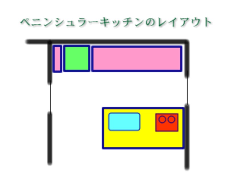 | 典型的なペニンシュラーカウンターのキッチンレイアウト。コミュニケーションキッチンをコンパクトなスペースで構成するためにはアイランドキッチンよりも成立しやすいプランです。 |