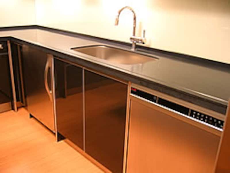 コーナー左とシンク右下にはASKOのビルトイン食器洗い機。シンク左下にはVIKINGのアンダーカウンタービルトイン冷蔵庫を組込み。
