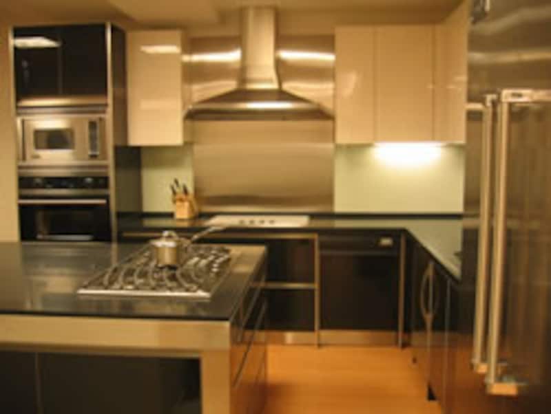 キッチンデザインはブラックとホワイトのツートンカラーでシンプルにまとめたインテグレートキッチンに、VIKING社のデザイナーシリーズのキッチン機器がビルトインされています。このクックトップはホワイトフェースの電気式ラジエントヒータ・クックトップ、レンジフードはヤマゼンのクックフードル。 |