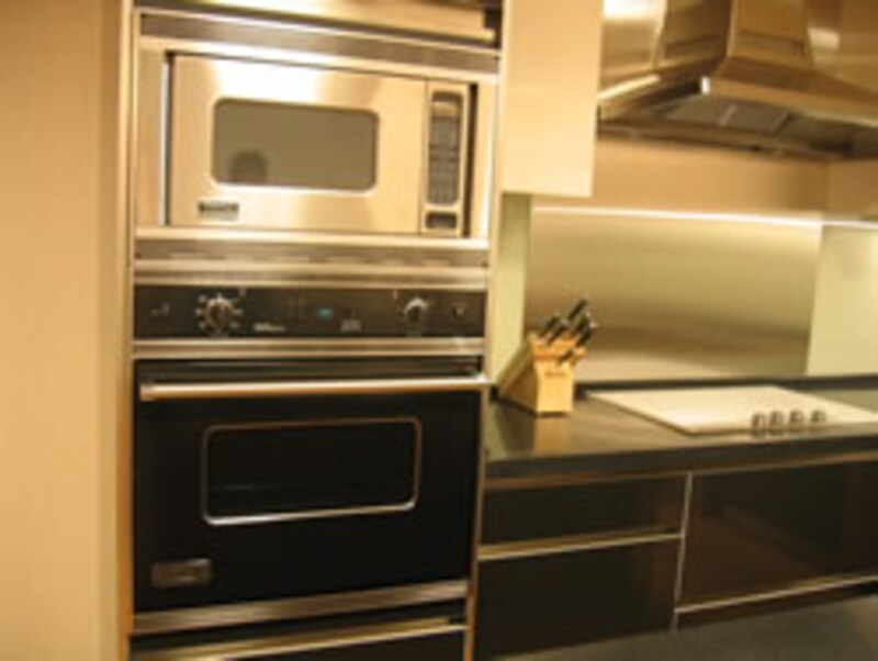ショールーム中央にはフリースタンディングタイプとスライドインタイプのガスレンジ5機種とビルトイン食器洗い機が2機種セットされている。右からマジックシェフ20インチ・コンパクトタイプガスレンジ、コンパクトといってもオーブン容量は64リットル。次の大型ガスレンジがVIKINGプロフェッショナルシリーズ36インチモデル。3800Kcalのバーナー4口と中央はグリドル(網焼き)やグリル(鉄板焼)がチョイスできる。