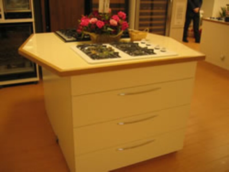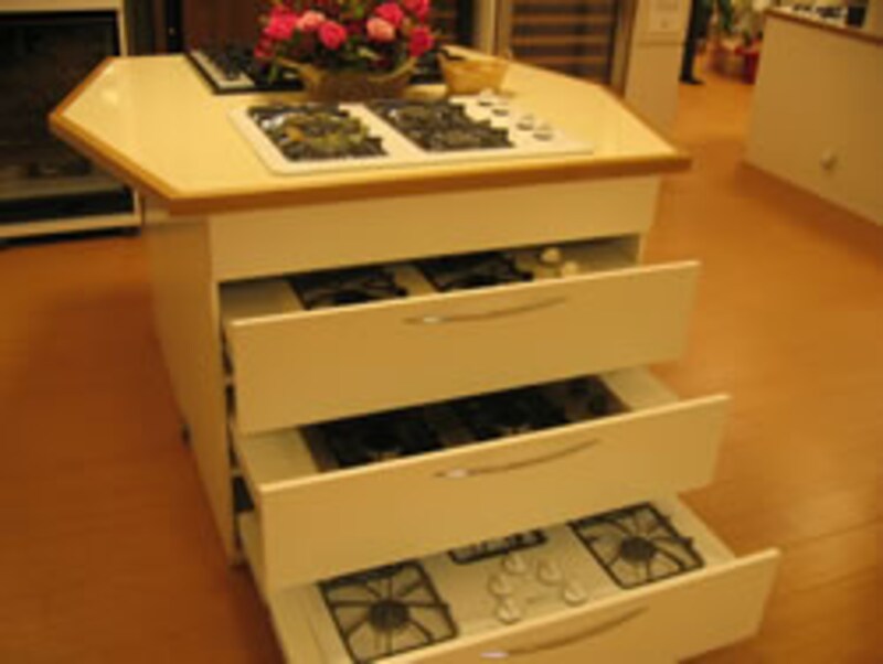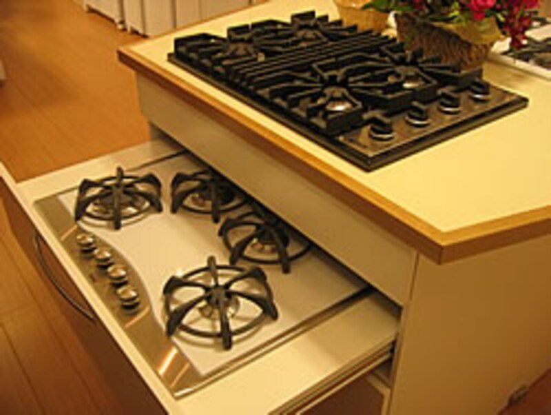 アイランド型のクックトップ展示台。マジックシェフとバイキングのクックトップバリエーションが展示されている。 |