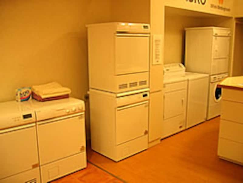 ユーティリティコーナーにはアメリカWhite-Westinghouse社とスウェーデンASKO社の衣類洗濯機・乾燥機合計8台すべて稼動できる状態で展示されている。衣類の洗濯乾燥サイクルの確認は勿論のこと作動音や振動の確認までできるのが魅力だ。